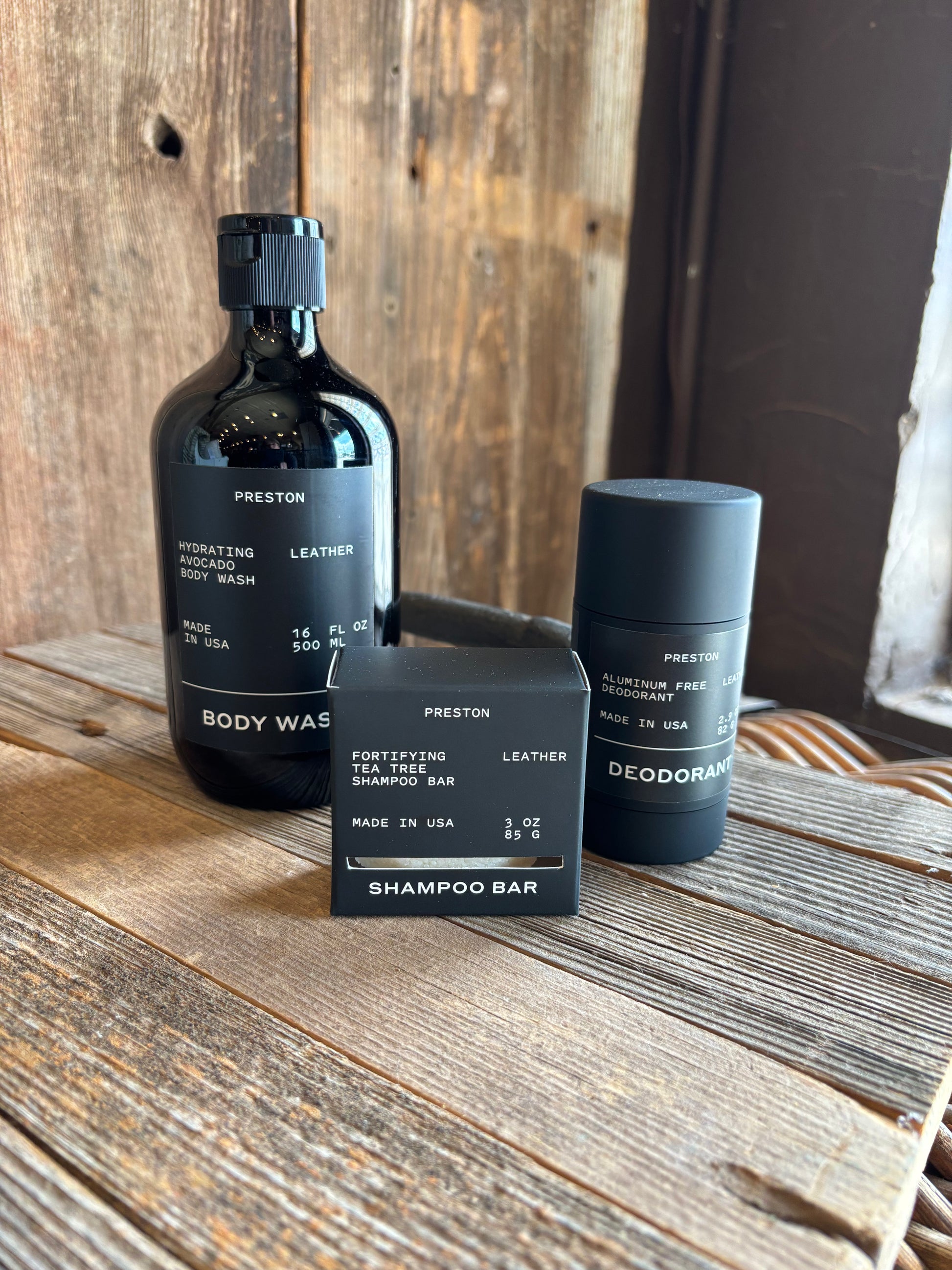 Preston for Men is made in the USA. Hydrating avacado body wash, aluminum free deodorant & fortifying tea tree shampoo bar in a masculine scent.